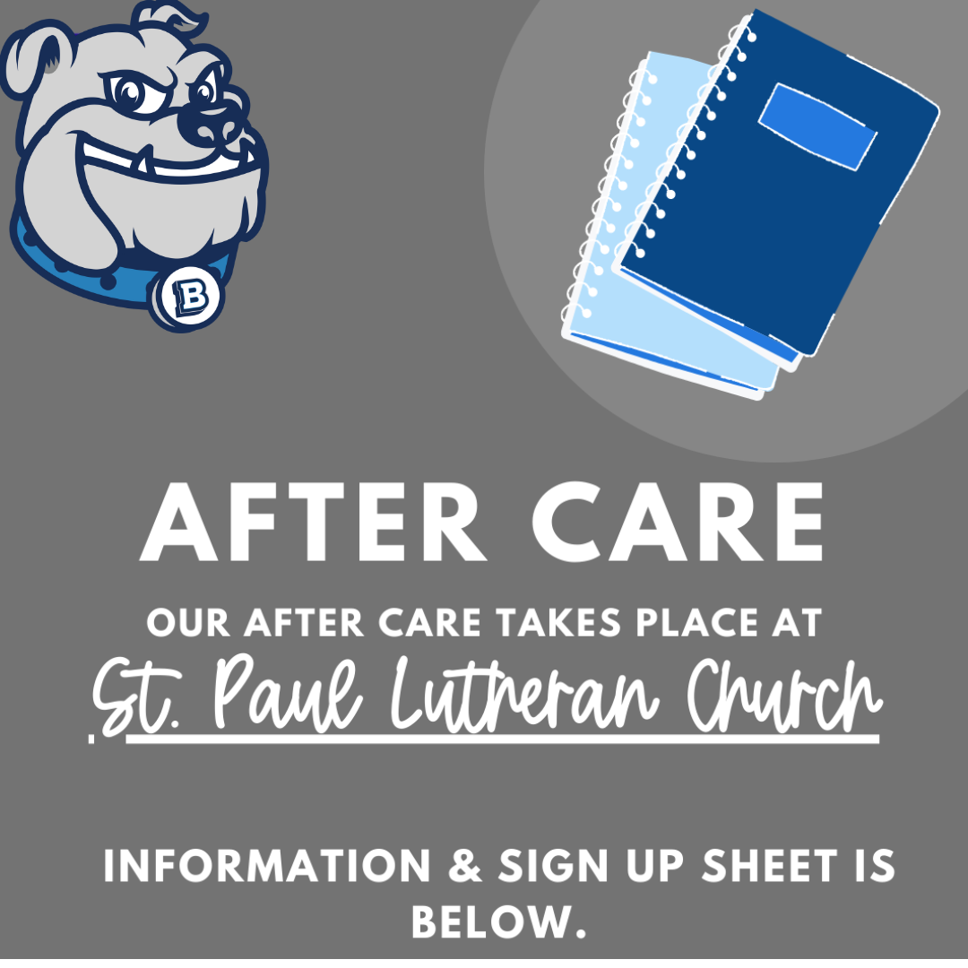 Our after school program is available through St. Paul's St. Lutheran Church. Their after school care counselors come classroom to classroom to pick up students before dismissal. They offer snacks and homework help to the students.